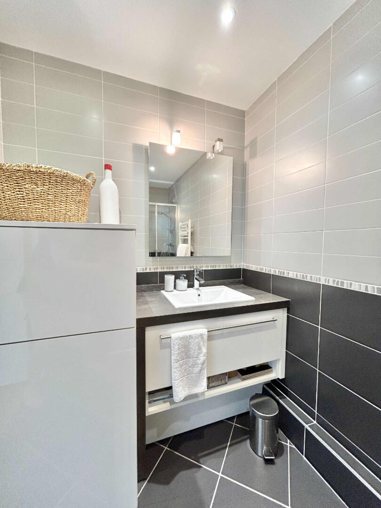 - la grande chambre avec son dressing et sa salle d'eau équipée (lave-linge...) - les nombreux rangements - les WC suspendus avec lave-mains